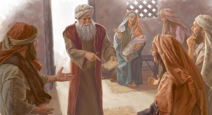 Sementara itu orang banyak menanti-nantikan Zakharia. Mereka menjadi heran, bahwa ia begitu lama berada dalam Bait Suci. Ketika ia keluar, ia tidak dapat berkata-kata kepada mereka dan mengertilah mereka, bahwa ia telah melihat suatu penglihatan di dalam Bait Suci. Lalu ia memberi isyarat kepada mereka, sebab ia tetap bisu. Ketika selesai jangka waktu tugas jabatannya, ia pulang ke rumah. Beberapa lama kemudian Elisabet, isterinya, mengandung dan selama lima bulan ia tidak menampakkan diri, katanya: “Inilah suatu perbuatan Tuhan bagiku, dan sekarang Ia berkenan menghapuskan aibku di depan orang.” (Lukas 1: 5-25).