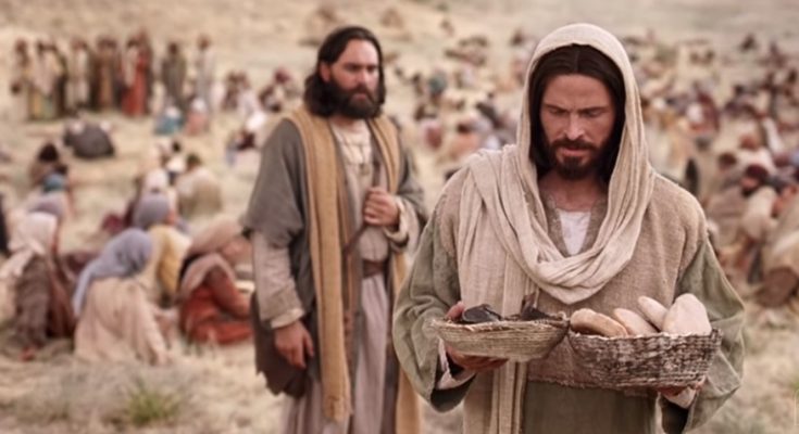 Lalu disuruh-Nya orang banyak itu duduk di rumput. Dan setelah diambil-Nya lima roti dan dua ikan itu, Yesus menengadah ke langit dan mengucap berkat, lalu memecah-mecahkan roti itu dan memberikannya kepada murid-murid-Nya, lalu murid-murid-Nya membagi-bagikannya kepada orang banyak.