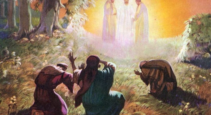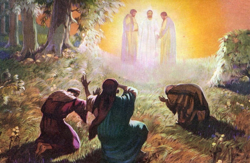 Keduanya menampakkan diri dalam kemuliaan dan berbicara tentang tujuan kepergian-Nya yang akan digenapi-Nya di Yerusalem. Sementara itu Petrus dan teman-temannya telah tertidur dan ketika mereka terbangun mereka melihat Yesus dalam kemuliaan-Nya: dan kedua orang yang berdiri di dekat-Nya itu.